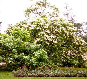 = Wordt tot 12m hoog. Bladeren tot 20cm groot. Bloemen witmet gele vlekken, gevolgd door lange peulvruchten.