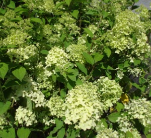 Pluimhortensia tot 150 cm hoog met roomwitte tot limoenkleurige bloemen in augustus-september.
