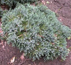 Bodembedekkende conifeer tot 75 cm met bolvormige structuur en blauwgrijze schubben.