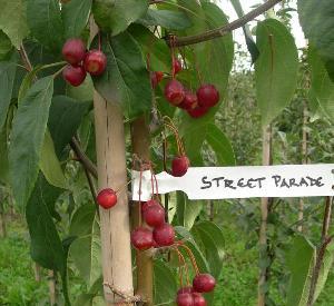 = Zuilvormige selectie tot 6 meter hoog met witte bloei en paarsrode vruchten.
