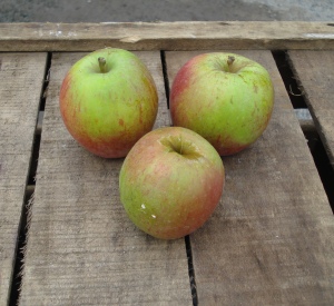 Kleine groengele harde moesappel, rijp december en bewaart tot mei.