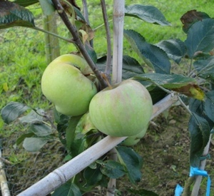 Gele zoetzure appel met roze blos, rijp in november en bewaart tot mei. De vruchten kunnen makkelijk tot Kerstmis op de boom blijven hangen.