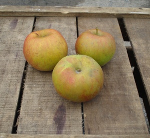 Dessertappel met geelbruine ruwe schil, rijp in november en bewaart tot maart.