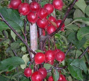 = Zuilvormige boom tot 5 meter met grote lichtrose bloemen en rode vruchten.