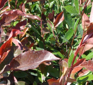 Bladhoudende struik, 1.50 tot 2m, jong blad is rood.