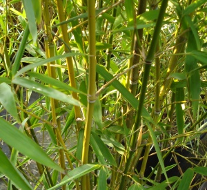 Bamboe met groen blad en geelachtige stengel tot 400 cm hoog.