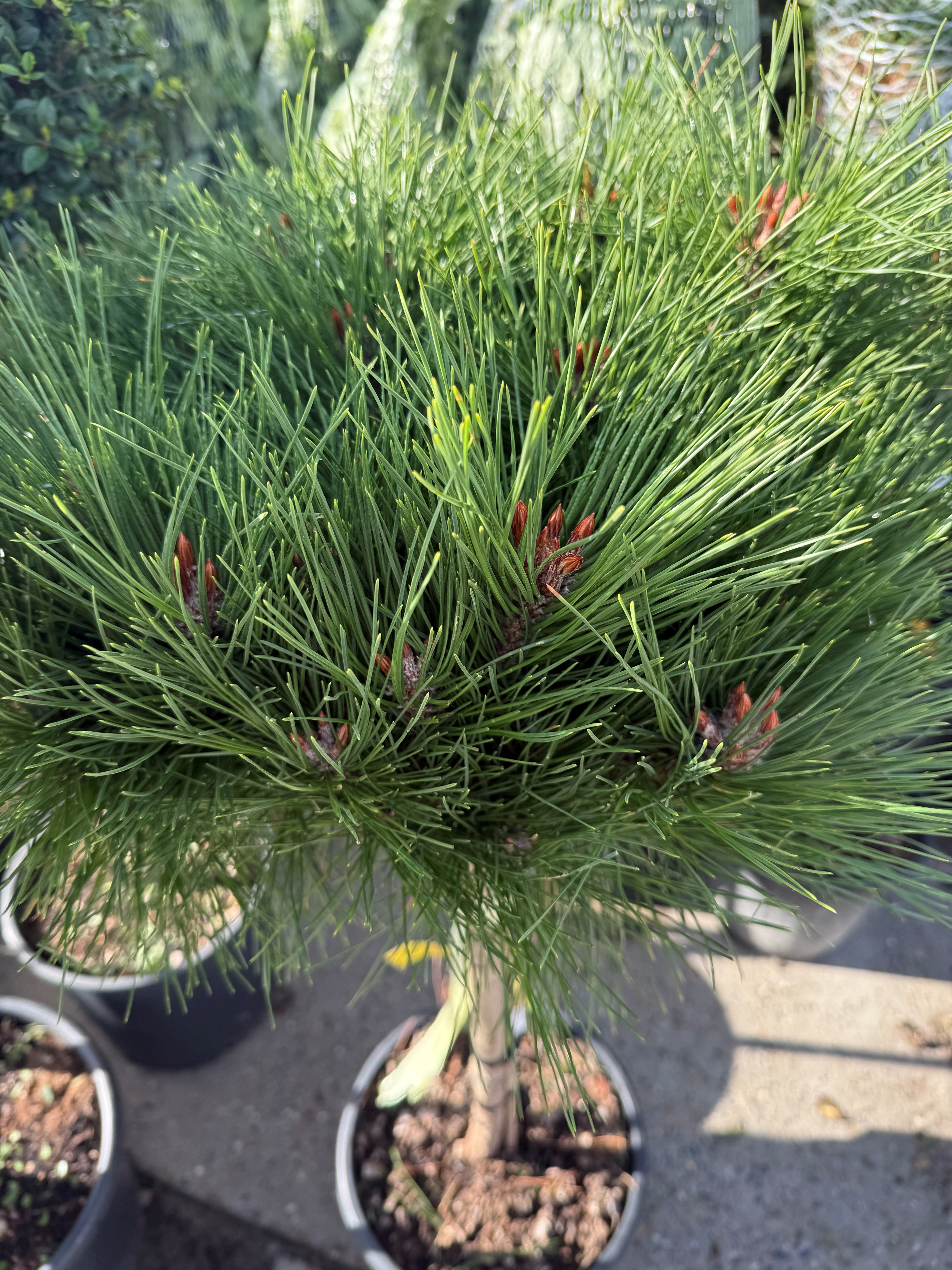 = Pinus nigra 'Brepo'. Bolvormige, laag compact blijvende pijnboom met groene naalden.