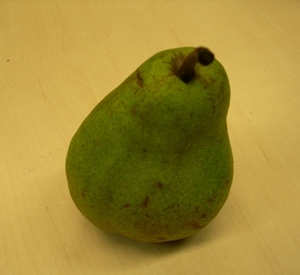 Dikke groene peer met lekker vruchtvlees, rijp in oktober en bewaart tot december.