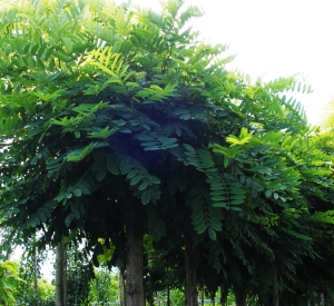 = Bolacacia. Bladeren frisgroen. Meest aangeplante sierboom, langs opritten, terrassen,...