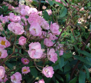 Kleinbloemige, doorbloeiende heesterroos tot 150 cm met roze bloemen.