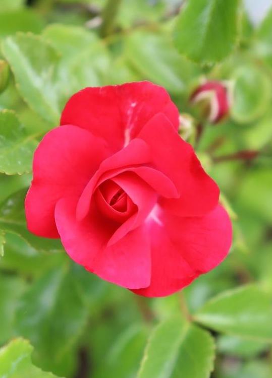 Zeer sterke bodembedekkende roos met middelgrote frambozenrode bloemen
