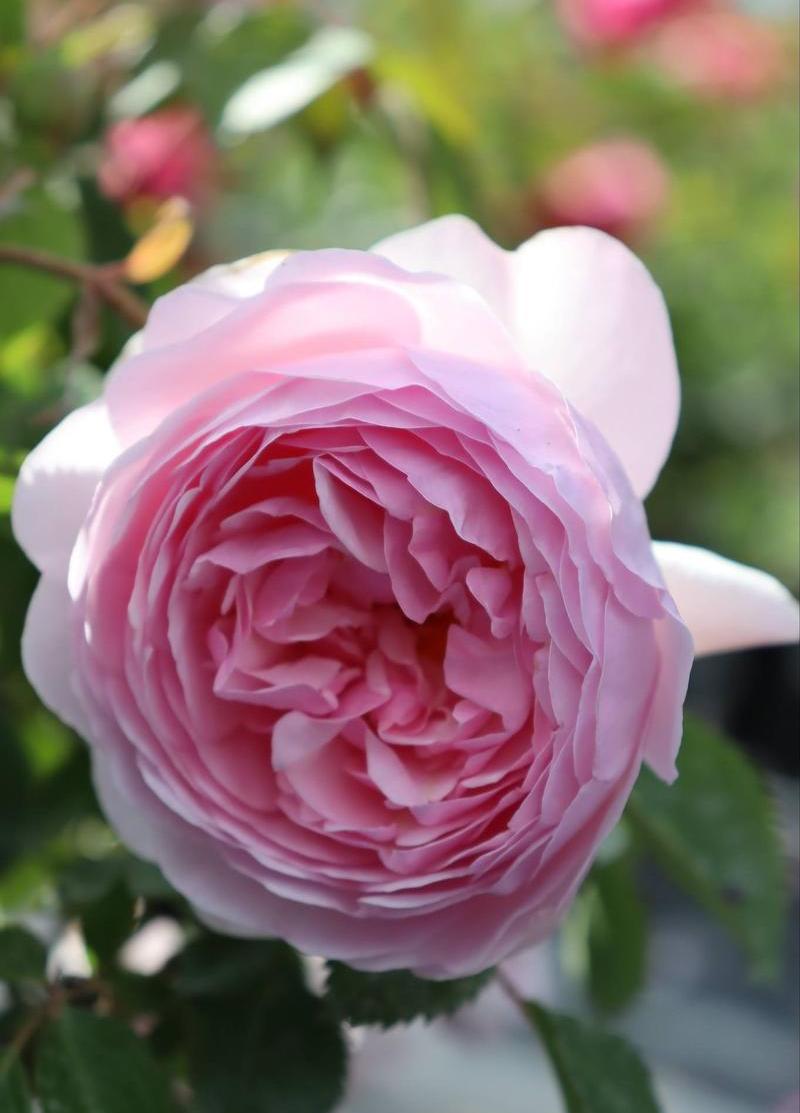 Heesterroos tot 1 m met zachtroze, goed geurende volle bloemen. Herbloeiend