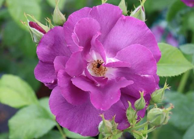 Doorbloeiende heesterroos tot 100 cm hoog met paarse bloemen.