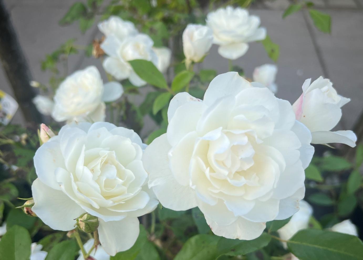 Doorbloeiende struikroos op stam met witte bloemen van juni tot oktober