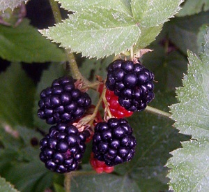 Doornloze braam met zwarte vruchten, vanaf midden augustus tot oktober.