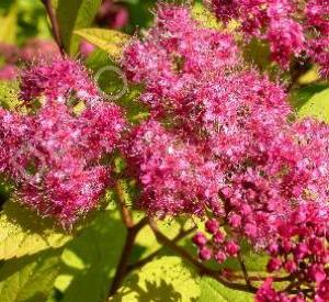 = Struikje tot 100 cm hoog met opvallende, goudgele bladeren in mei - juni. Bloemen = roze schermen van juni tot september. Plantafstand = 50 cm.