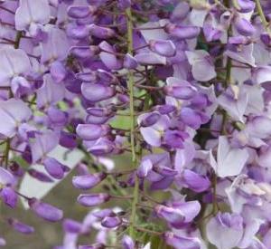Klimplant tot 6 meter hoog met violetpaarse bloemen in 20-25 cm lange, dikke geurende bloemtrossen in mei-juni.